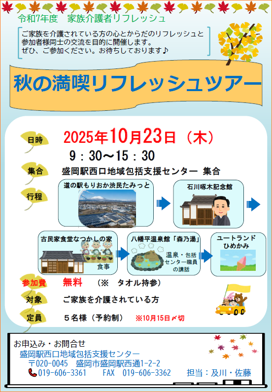 家族介護者リフレッシュツアーを開催します 2025年10月14日 ご家族を介護されている方の心と体のリフレッシュと、参加者同士の交流を目的に開催します。 【対象】盛岡市に在住かつ在宅で要介護1以上の高齢者や認知症の高齢者、または一人での外出が難しい身体に重度の障がいをもつ者等の介護を現に行っている同居の家族 詳しくは以下のチラシをご覧ください。問い合わせ:盛岡駅西口地域包括支援センター TEL019-606-3361 < 前の記事へ 記事一覧へ